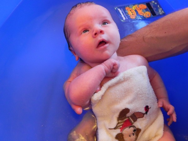 Hier werde ich gerade das erste Mal gebadet. Zum Glück hält mich Papi ganz fest, denn ganz geheuer war mir das nicht. Doch so langsam habe ich mich daran gewöhnt und genieße es.